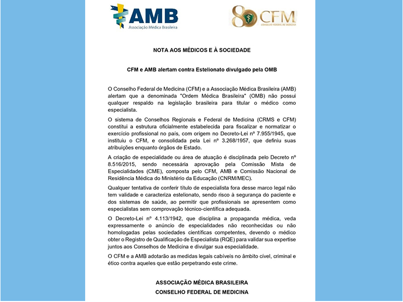 O Conselho Federal de Medicina (CFM) e a Associação Médica Brasileira (AMB) alertam médicos e sociedade sobre a atuação irregular da denominada “Ordem Médica Brasileira” (OMB).